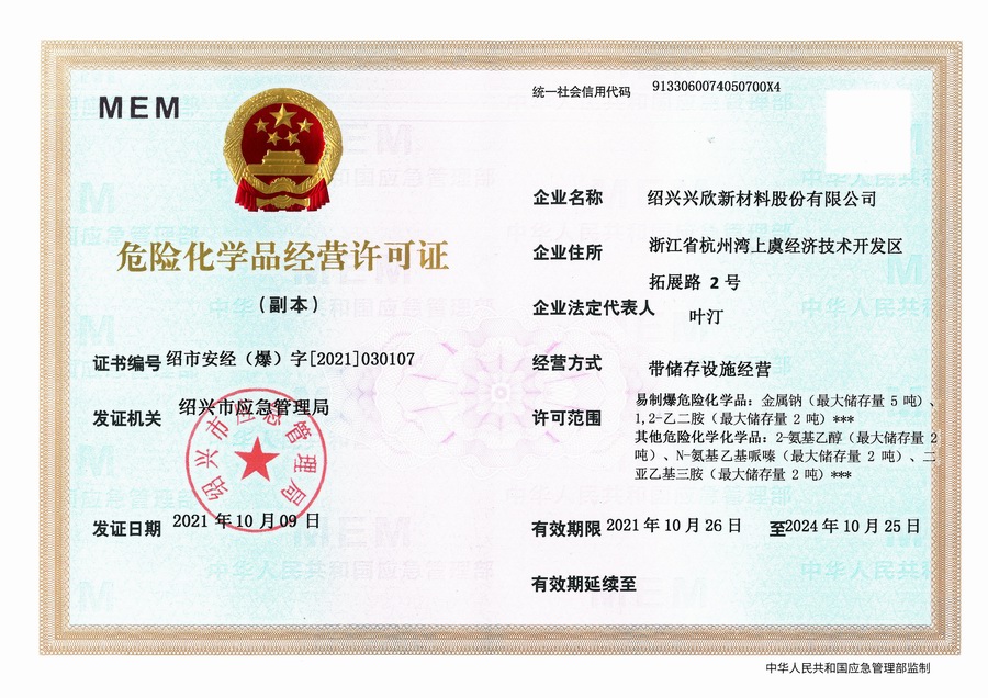紹興興欣新材料股份有限公司成立于2002年06月27日,占地面積122畝,位于杭州灣上虞經濟技術開發區拓展路2號,現有職工200余人,專業技術人員50余人;博士、碩士研究生30余人組成的一支知識型、專業化的技術科研團隊。公司面向全球市場,專業開發電子化學品、環?;瘜W品、醫藥中間體、高分子材料等先進新材料重點領域的省級科技型企業;建有浙江上虞、安徽東至兩個生產基地。目前為“國家高新技術企業”、浙江省“隱形冠軍”企業、浙江省專精特新中小企業;建有“省級”研究開發中心,共建天津大學浙江紹興研究院電子化學品研發中心。